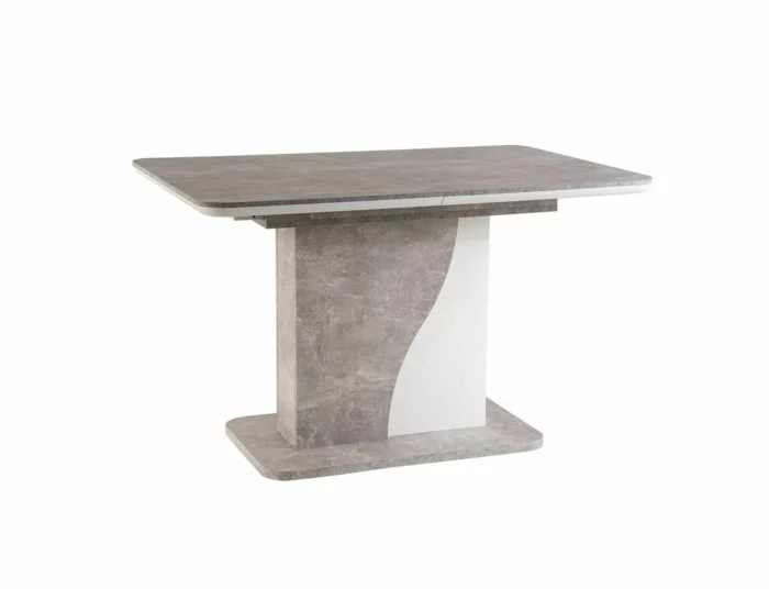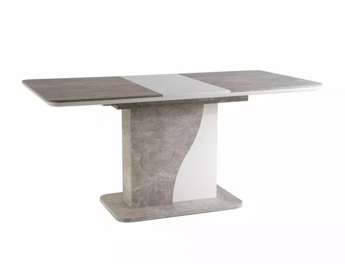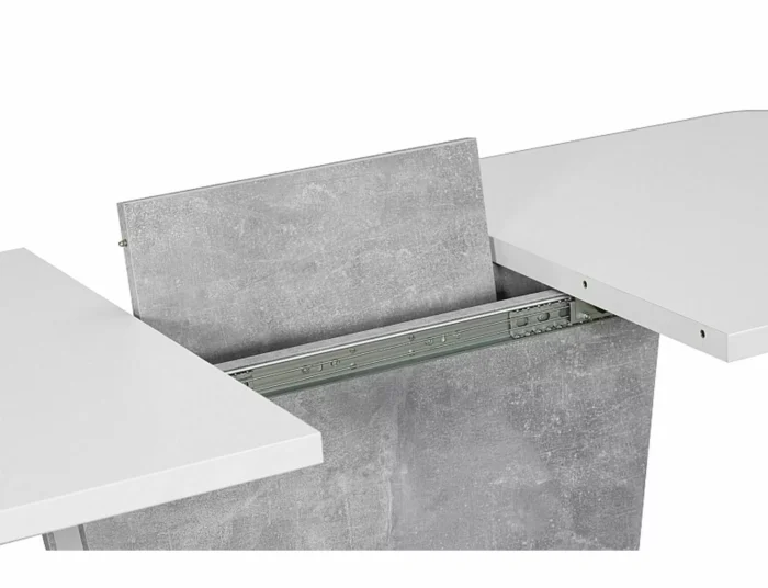 Extendable table, top: laminated board, frame: laminated board, color: matte white / gray, concrete effect. Additional top hidden in the leg.