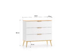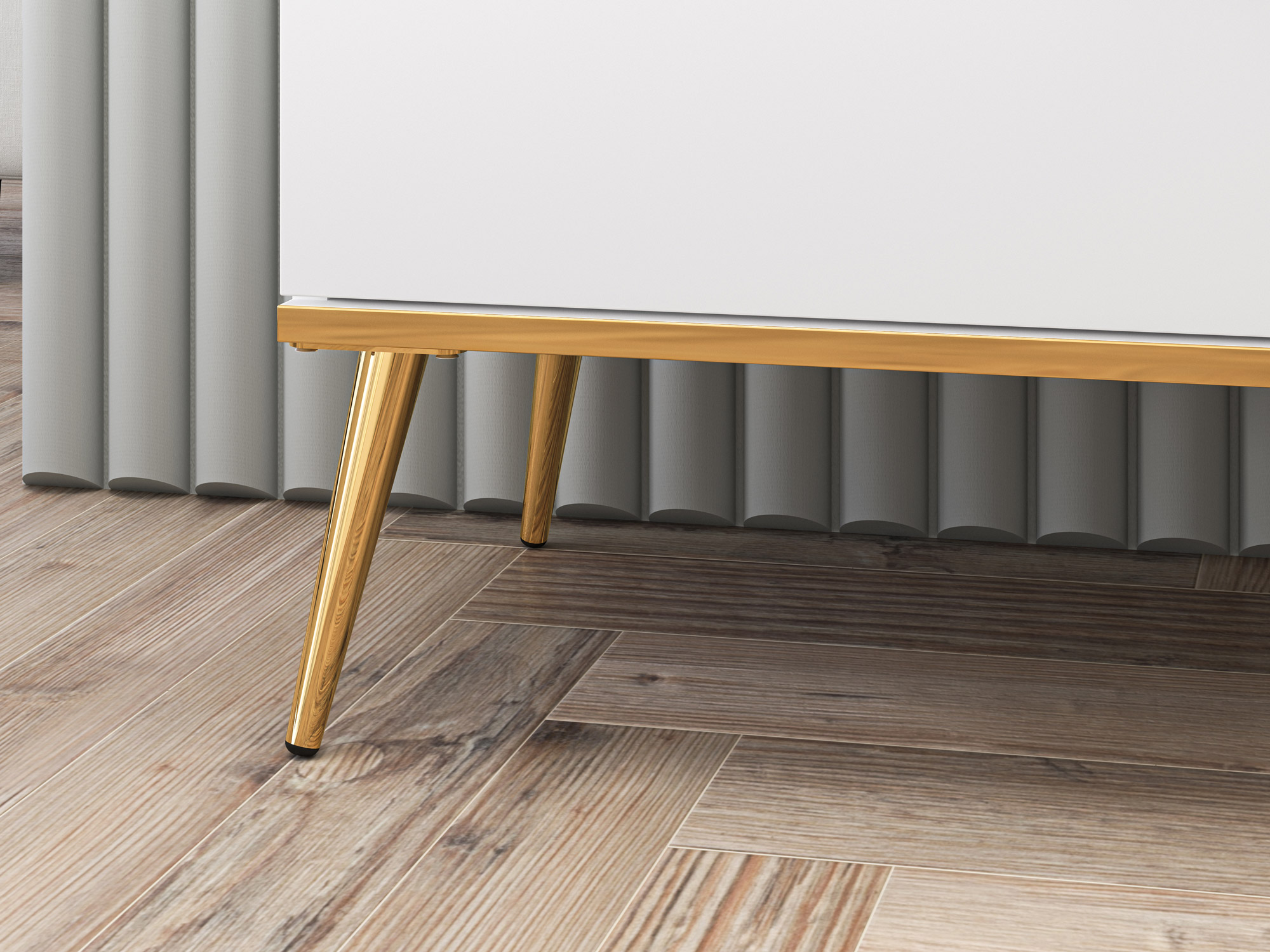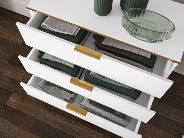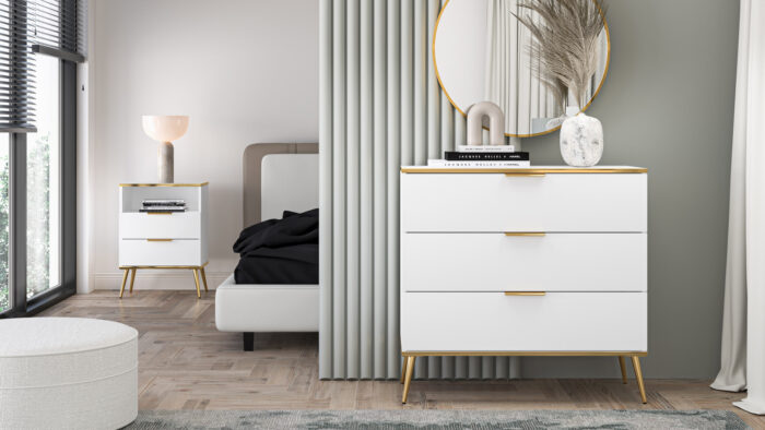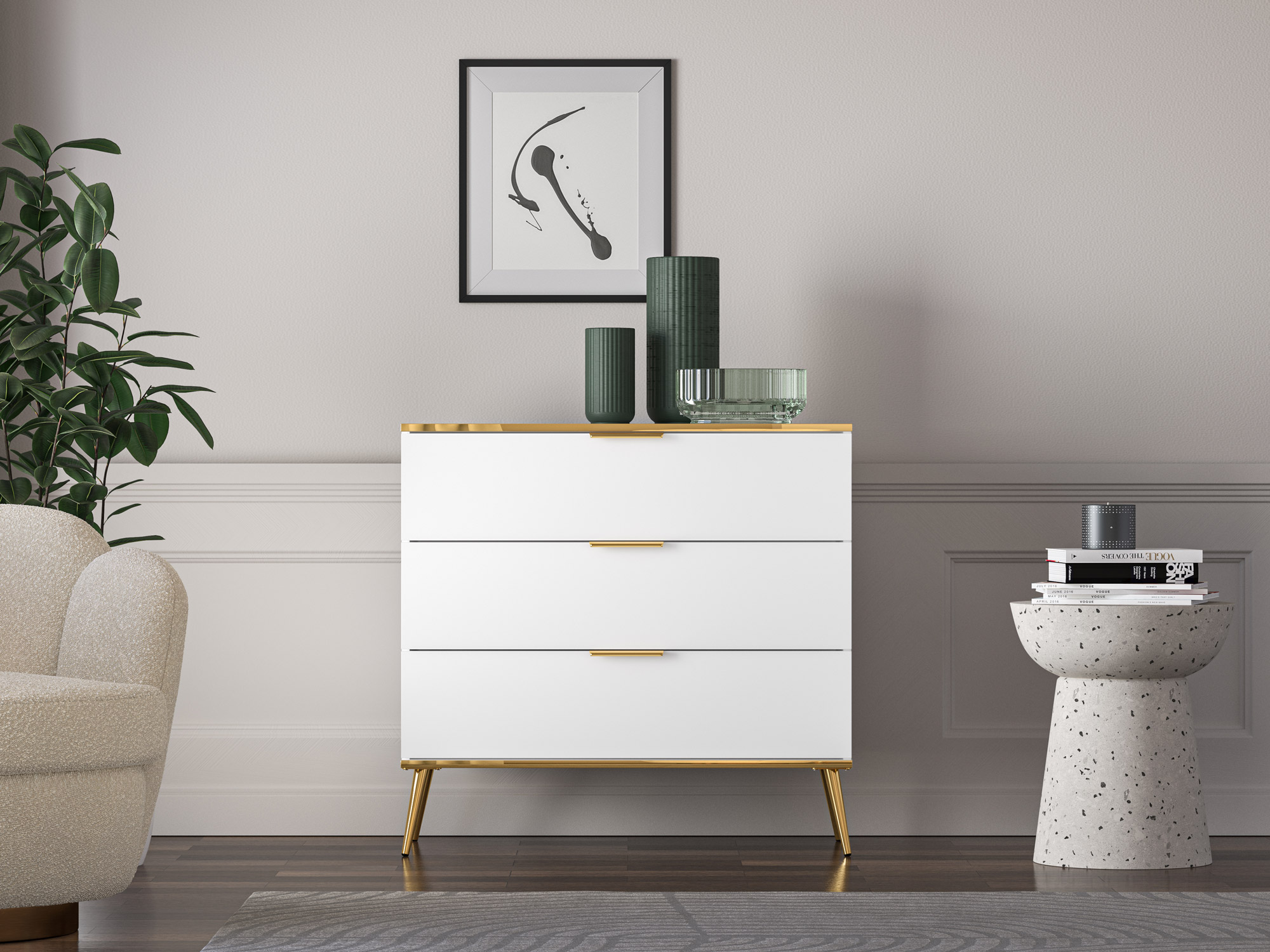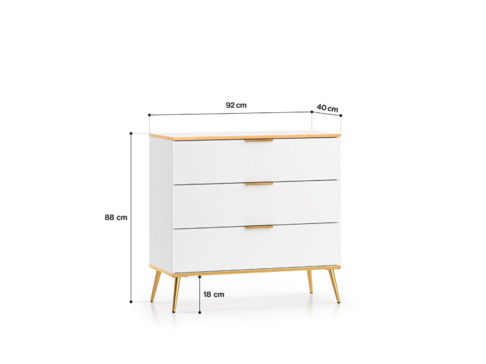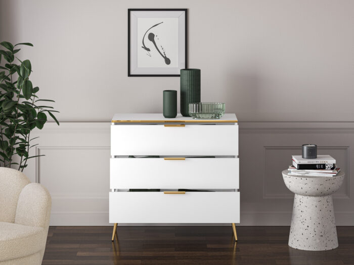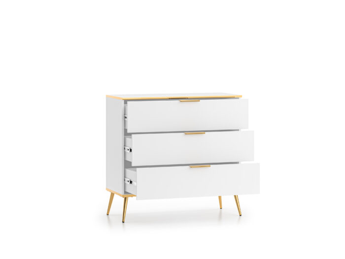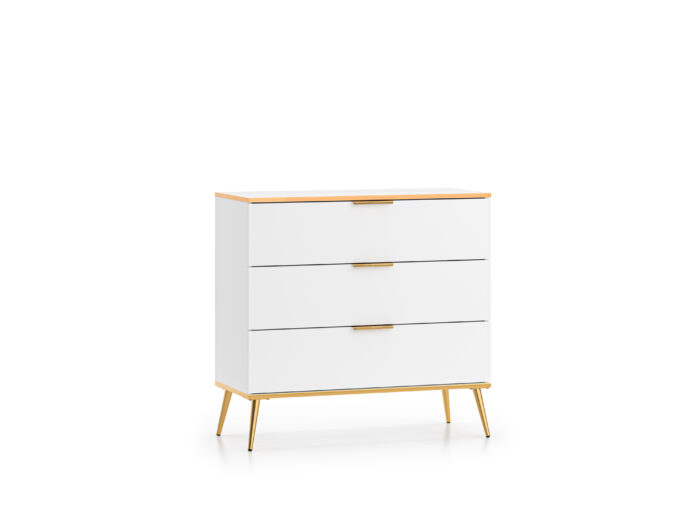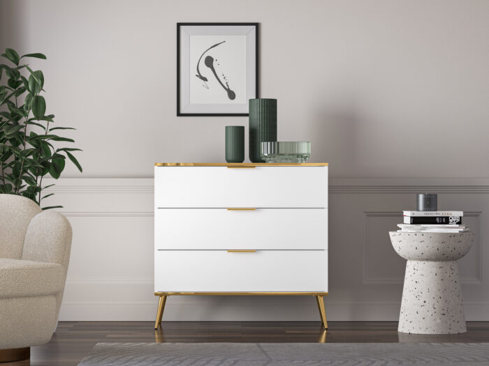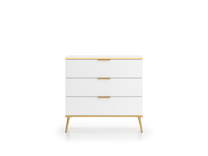 Komoda Viterbo 05 is not only a spacious piece of furniture, but also an additional space to display favorite items on a large countertop. Thanks to three capacious drawers with increased load capacity, you can store accessories, documents, or a large quantity of clothes and lingerie. The possibility of full extension of the drawers guarantees easy access to all items inside. This furniture is a combination of contemporary elegance and minimalist style. The white decor, metal legs, handles, and gold-colored veneer on the tops are the quintessence of the Viterbo collection. • Drawer slides with convenient full extension option. • Reinforced bottom increases drawer load capacity. • High, metal legs facilitating cleaning under the furniture. • Functional furniture in a beautiful edition.