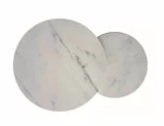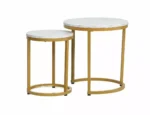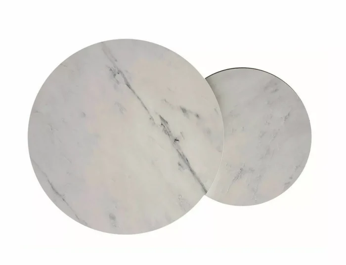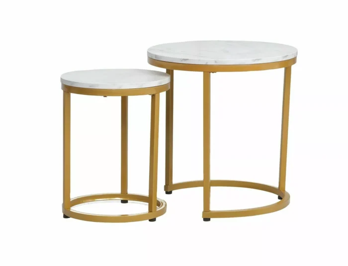 Комплект столиков, столешница: ламинированная доска, каркас: металл, цвет: белый, эффект мрамора / золото. Размеры меньшего стола: диаметр 32; высота: 42 см.